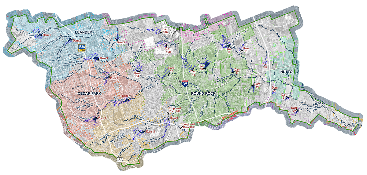 The District is the local sponsor of the original 23 dams built across south central Williamson County which includes the commitment to safely operate, protect, and maintain the earthen dams. The original dams were built by the federal agency previously know as the Soil Conservation Service (SCS) which is now known as the Natural Resources Conservation Service (NRCS).